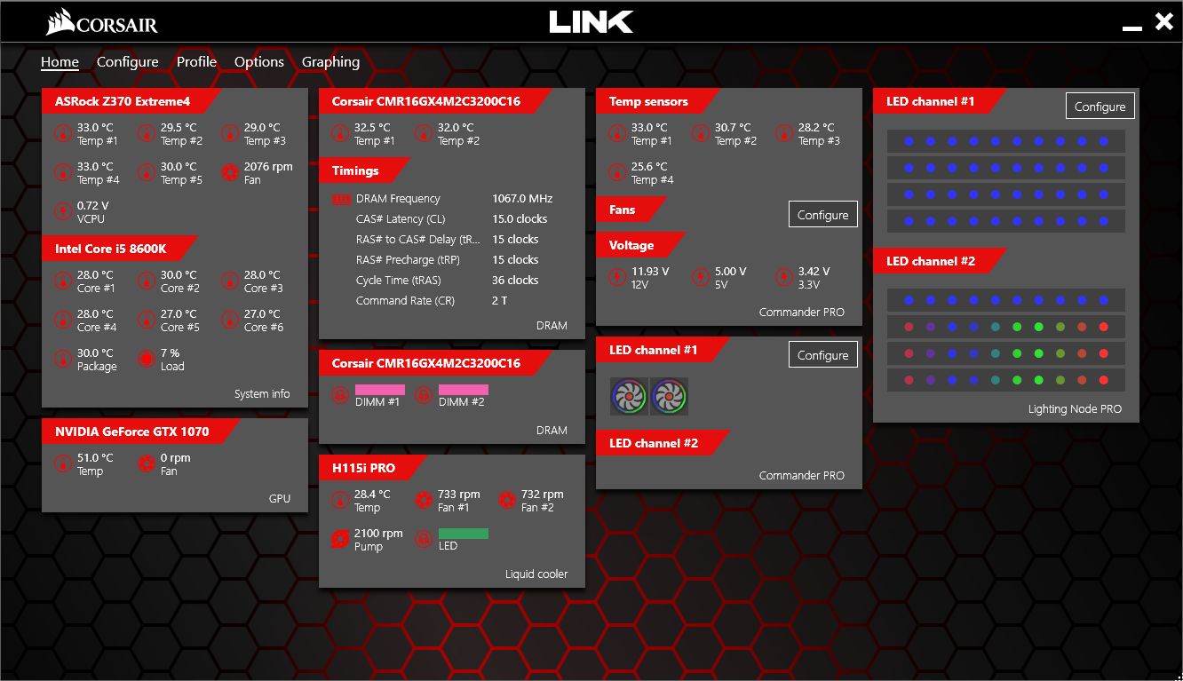 There are 5 light strips under components, 3 strips on backside and 2 fans on the coolerās radiator that we want to control. To get as big compatibility as possible, I chose to get all lightning components fromĀ CorsairĀ (notice that RAMs are Corsair too). It was also because it seems that Corsair offers the biggest variety of components for a reasonable price.