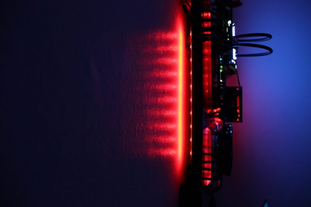 Each components is placed on a piece of acrylic which has a strip under it (five strips in total). The rest of the strips are placed on left, top and right backside of the board to give the computer a nice backlight. The bottom one was eliminated because of the cable placement on the backside, but with a bit of tweaking, or different cable positioning, you can have lights on all four sides. Each of the strip is individually controlled, which means that there are thousands of color combinations that you can make.